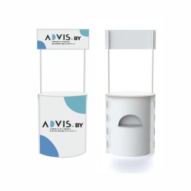 Промостойка со столешницей в форме овала — лучший выбор для того, чтобы представить продукцию. Конструкция сделана из прочного ПВХ. Материал не боится механических воздействий, отличается долговечностью и прочностью. Устройство легко собирается и разбирается, на этот процесс уходит меньше минуты. Размер стойки составляет 210 х 80 х 50 сантиметров. В основу производства лег не только поливинилхлорид, но и ЛДСП 16 мм. Вес оборудования ровно 6 килограмм.